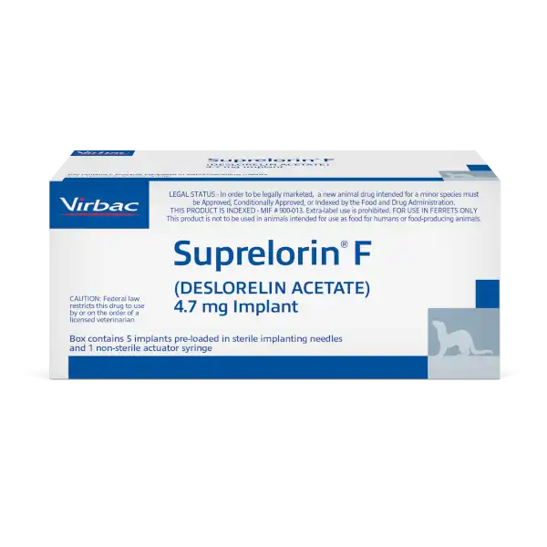 SUPRELORIN® F (deslorelin acetate) Implant (4.7 mg) is Legally marketed as an FDA Indexed Product under MIF 900-013. FOR USE IN FERRETS ONLY. Extra-label use is prohibited. This product must not be used in animals intended for use as food for humans or other animals.